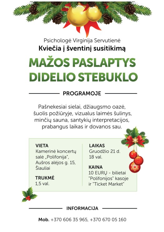 Pasitikite gražiausias metų šventes atradę sielos ramybę, pasinerdami į džiaugsmo oazę kartu su agentūros psichologe Virginija Servutiene. Kviečiame visus į šventinį susitikimą ,,Mažos paslaptys didelio stebuklo“. Mūsų laukia pašnekesiai sielai, vizualus laimės šulinys, gera nuotaika ir šiltos emocijos.